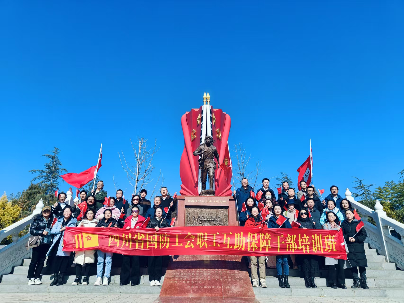 四川省国防工会职工互助保障干部培训班礼州红军广场合影